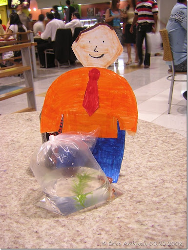 Flat Stanley and me went out today to the shopping mall. We got a little fish in an other place. So that is Mr. Stanley and the fish after I took that I gave to a little boy was wearing green in the shopping mall. Look at my life is now.